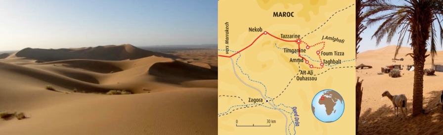 Cette randonnée chamelière d'une semaine est une approche en douceur du désert en compagnie des chameliers semi-nomades de la célèbre tribu des Aït Atta. Nous découvrons la palmeraie de Tazarine avec ses oasis, ses villages de pisé et ses gravures rupestres témoins d'activités pastorales, puis nous nous plongeons dans le désert : un désert noir de roches et un désert doré de sable. Les bagages sont transportés par les dromadaires et la gestion du camp est assurée par une équipe accueillante et joyeuse.