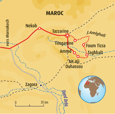 Nous ferons une halte au village de Taddert, le caravansérail d’altitude. Puis, Nous traverserons Ouarzazate et continuerons vers le sud par la vallée du Draâ en passant par la petite ville de Agdz et nous bifurquerons vers l’est jusqu’à Nkob, l’oasis de Tazarine puis Timganine, point de départ de la randonnée.